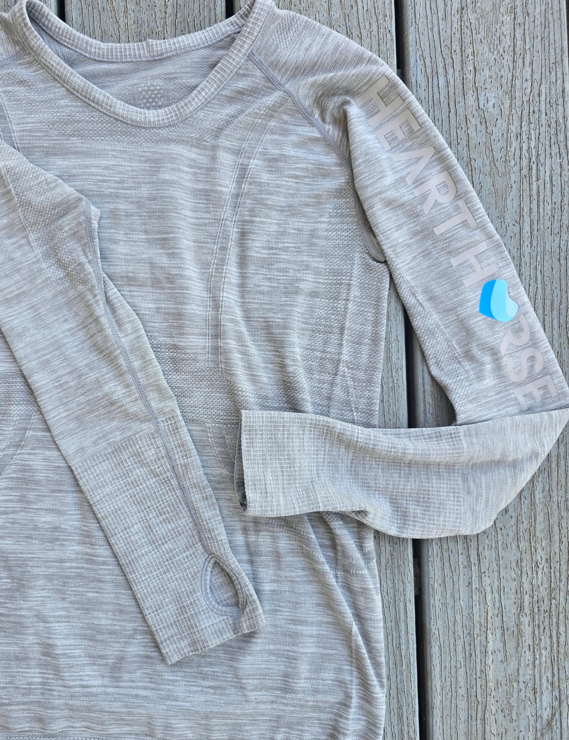 Super athletic, technical riding shirt. "Heart Horse" word logo on the left sleeve. Very comfortable and great for everyday. Thumbhole, long sleeves great for layering under a Heart Horse vest. Some of the colors are named after Heart Horses of our wonderful customers.