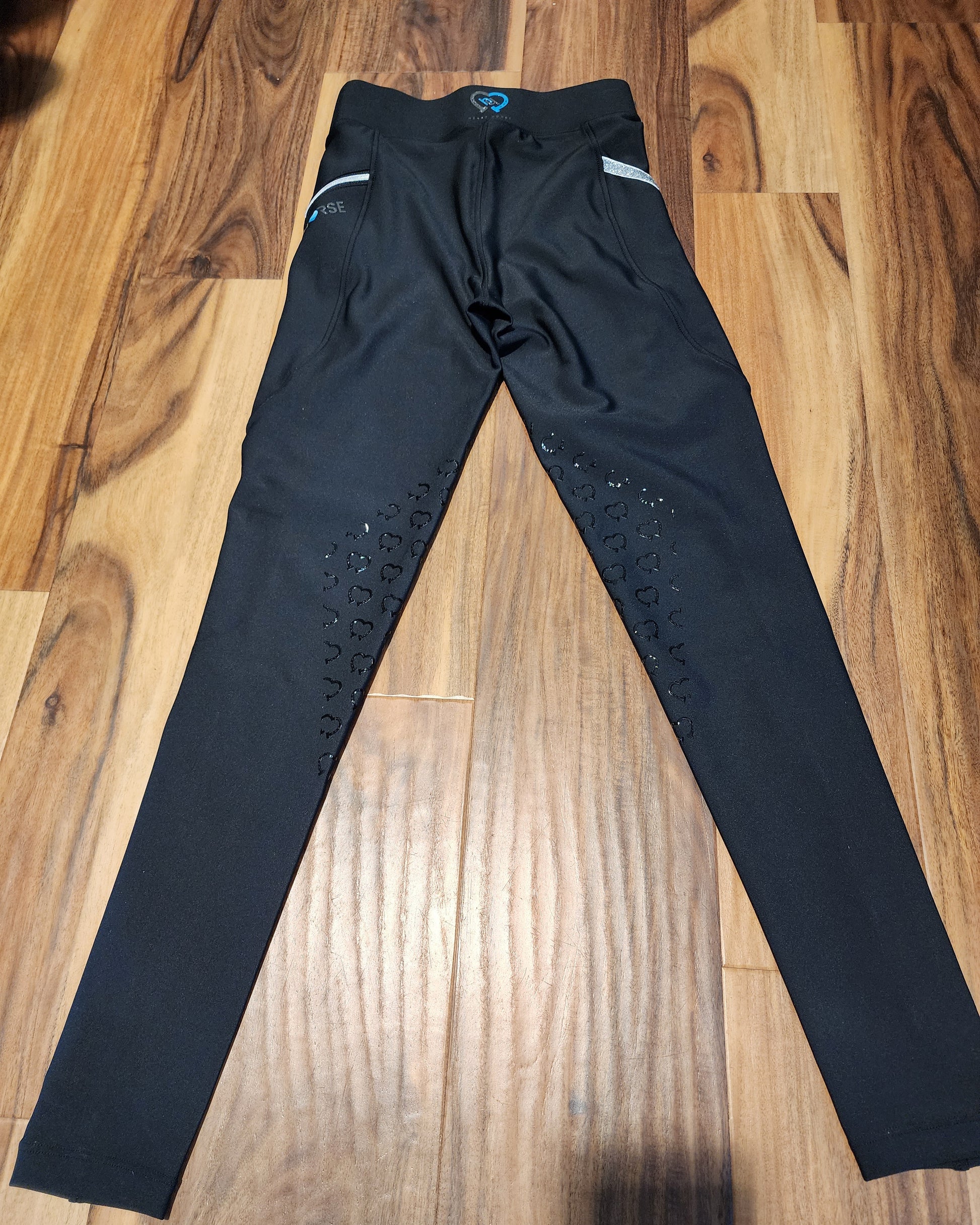 Heart Horse riding leggings are perfect for everyday riding and wear. High rise waist band with medium hold for support. Small zipper leg pocket and phone pocket. Breathable, moisture wicking material for the warmer weather. 4 way stretch, durable, flexible, and second skin feel for comfort. UV-protection. Offered in knee patch silicone grip. Available in Black.