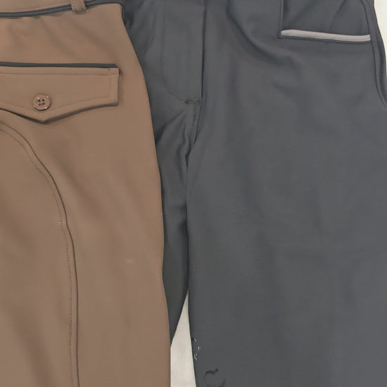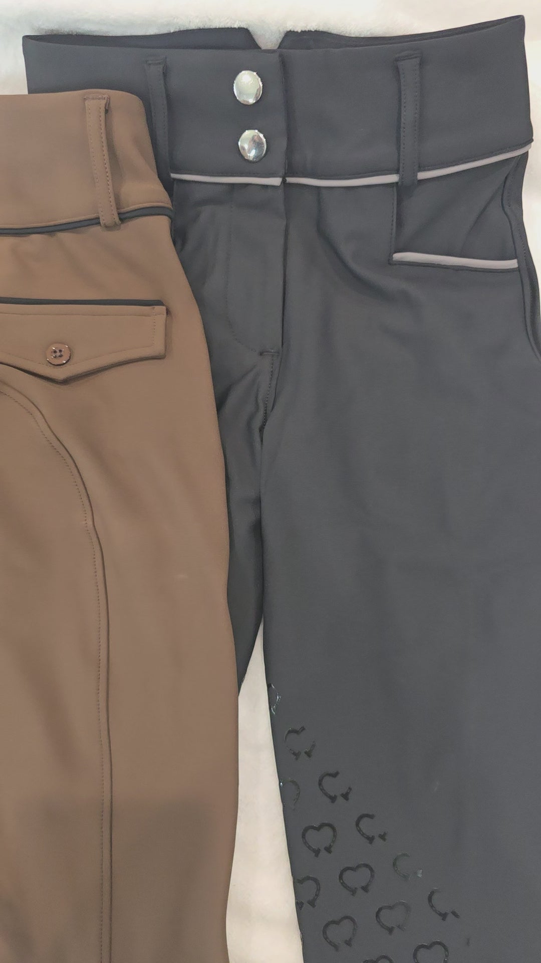 Beautiful, stylish, comfortable Breeches with monotone Heart Horse logo. Bootsock bottom and hook button front closure. Knee patch silicone grip. Available in Beige, Chocolate Brown and Jet Black. Sizes XXS -XXL.