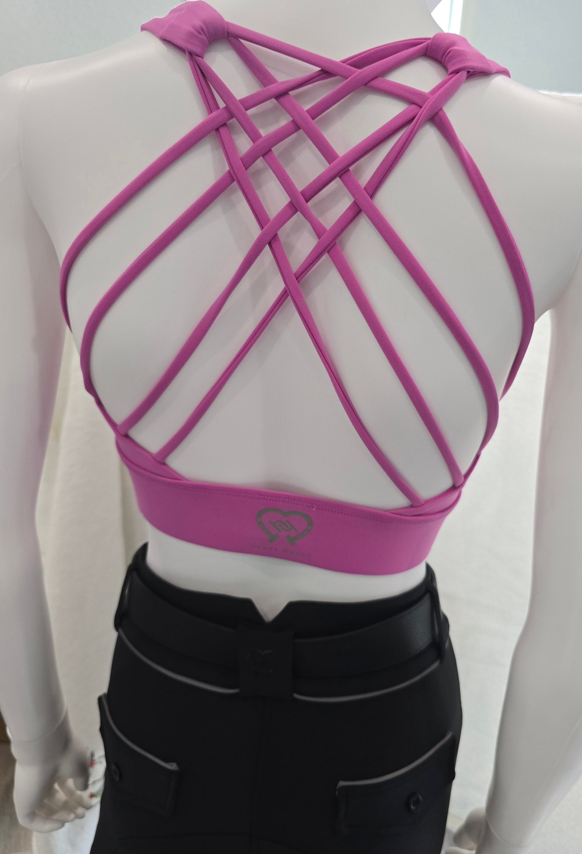 Beautiful and supportive sports bra with interlacing back, wide band, and padded front. Currently available in white and black with Heart Horse logo on the back. Perfect for showing or trail riding. Sizes XS/4 - XL/12.