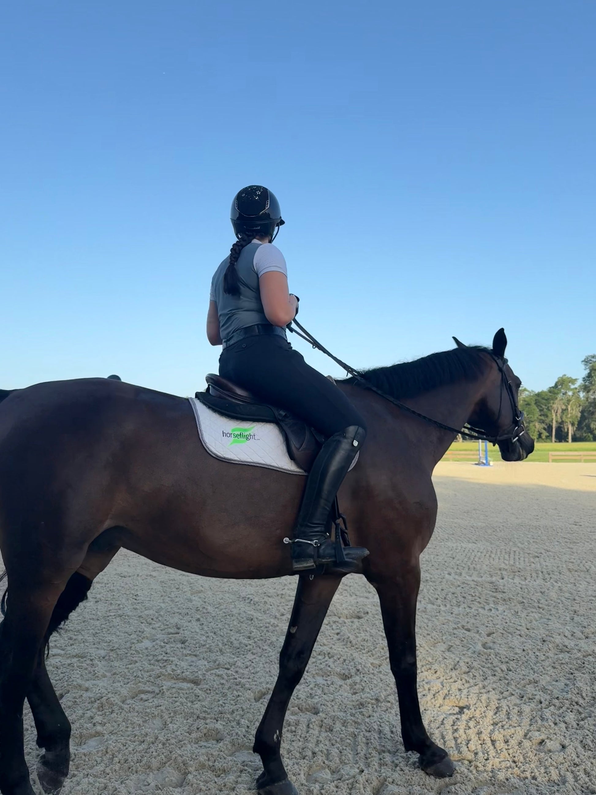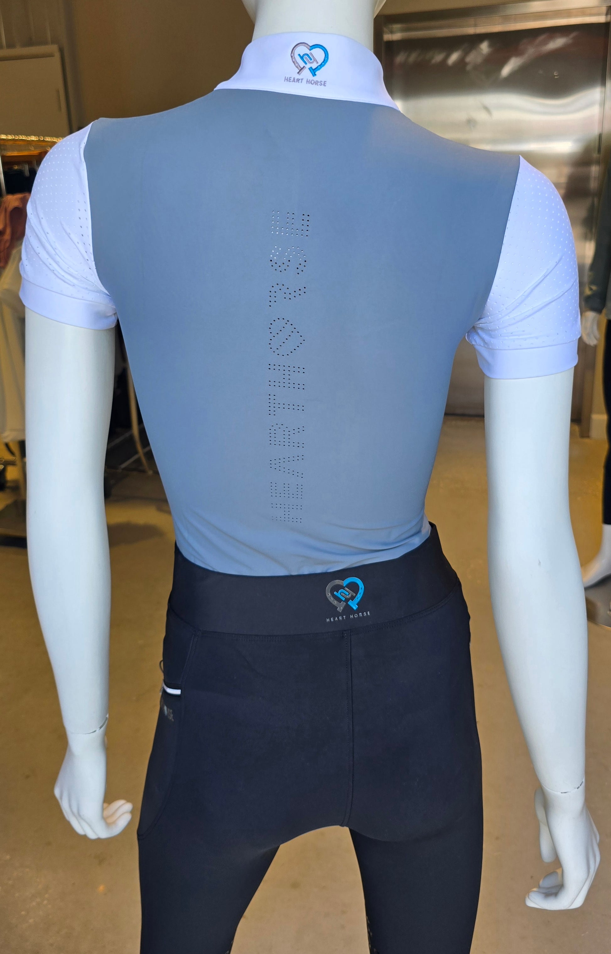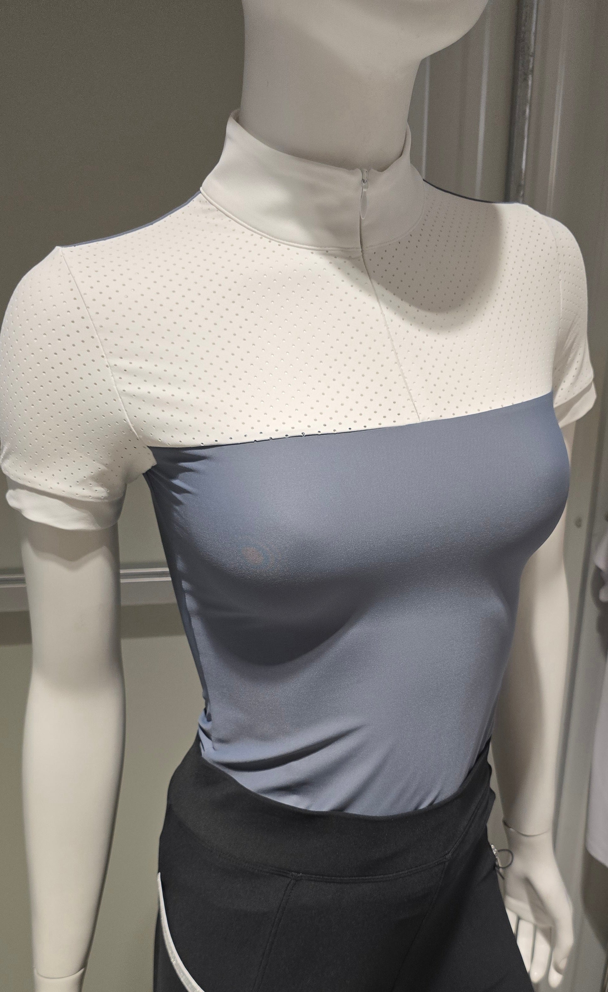 Perfect schooling shirt that is stylish and cool. Can also be a show shirt. Top and sleeves are perforated in white and front bottom and back of shirt are a solid color. Zipper closure goes to the top of the collar. They are fitted, so size up for a more loose fit.